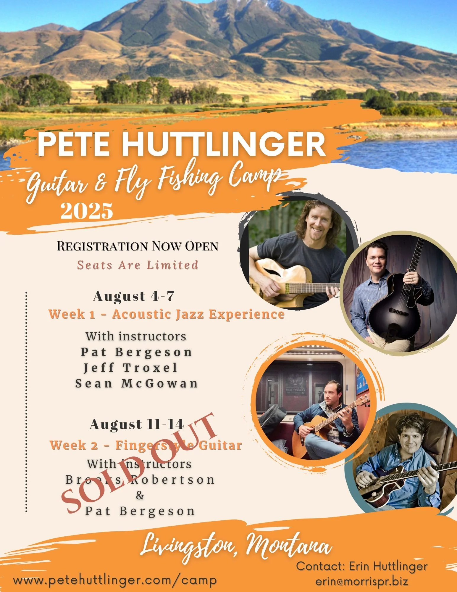 The Pete Huttlinger Guitar & Fly Fishing Camp has become a staple in the world of acoustic music camps. The world-renowned guitarist loved to teach, to jam, and to fly fish. So, in 2014 he and his wife Erin figured out a way to combine all three of his loves, and the camp idea was born. They chose the perfect spot—Music Ranch Montana, just outside of Livingston, Montana. A beautiful ranch nestled in Paradise Valley in the Absaroka Mountain Range and just north of Yellowstone National Park. After Pete passed away in 2016, Erin decided to continue hosting the camp as Pete would want all of us to keep making music together!